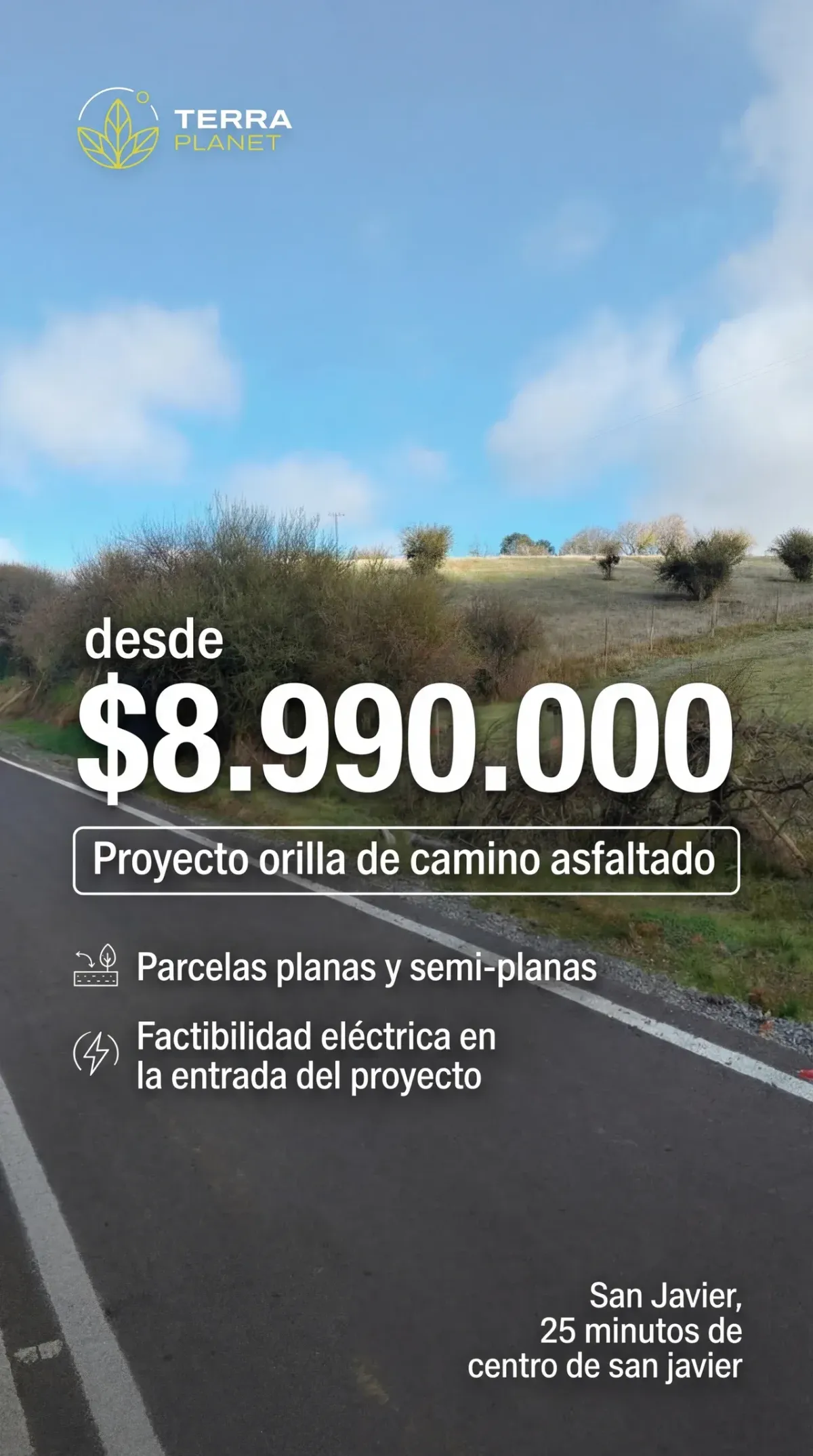 Inversión desde $8.990.000. Parcelas planas y semi‑planas, orilla de camino asfaltado. Factibilidad eléctrica en la entrada del proyecto.
